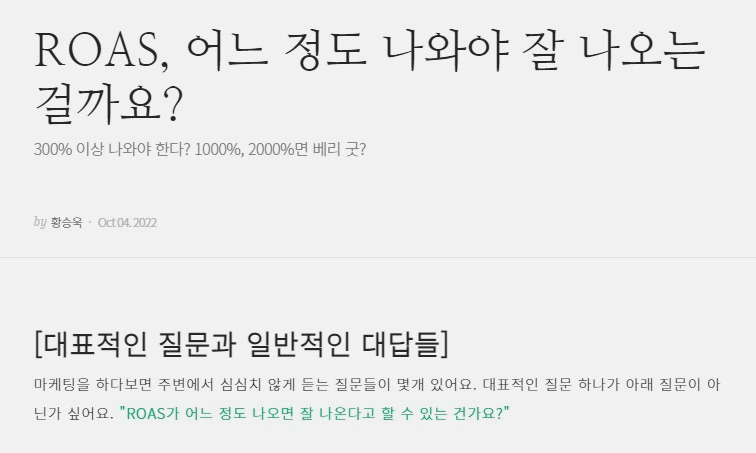 ROAS는, 온라인을 판매도구로 쓰는 모든 사업자가 높이고싶은 수치 입니다. 브런치 https://brunch.co.kr/@seunguk/61 를 참고하시면, ROAS가 높다고 마냥 좋은것은 아니다. 최소 300%는 나와야 한다. 마진률에 따라 다르다 등 내용이 잘 정리되어 있습니다.